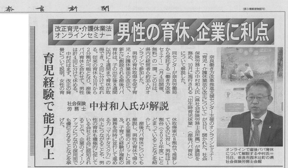 奈良新聞に掲載していただきました 6月15日(水)に開催した、奈良働き方改革推進支援センター主催、奈良労働局共催のオンラインセミナーの記事を6月17日(金)の奈良新聞に掲載していただきました。 セミナーテーマは「育児・介護休業法の改正について」 「男性の育児休業取得促進等への対応」というサブタイトルで約1時間お話させていただきました。 奈良新聞 令和4年6月17日(金)